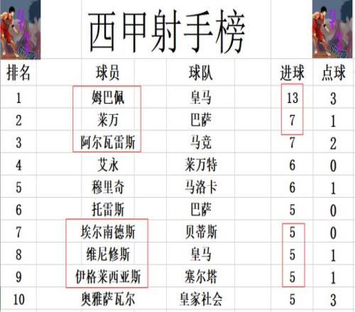 射手榜方面,姆巴佩13球依然是高居榜首,莱万今天上演帽子戏法后追了上来,追平阿尔瓦雷斯,两人7球并列第2,都是少姆巴佩6球。艾永,穆里奇6球并列第4,埃尔南德斯和伊格莱西亚斯今天都打入一球,追上托雷斯,维尼修斯,将前十门槛提高到5球。