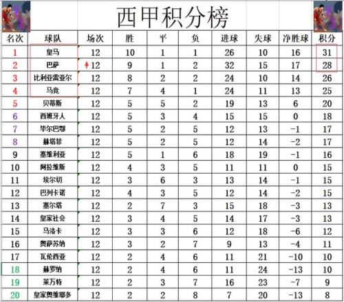 积分榜方面,皇马爆冷被弱旅逼平,4连胜被终止,不过他们还有领先优势。巴萨击败塞尔塔后,再次超过比利亚雷亚尔2分重回前2,同时将和皇马的差距缩小到3分。马竞近段时间也是连胜不断,他们差皇马6分排在第4。