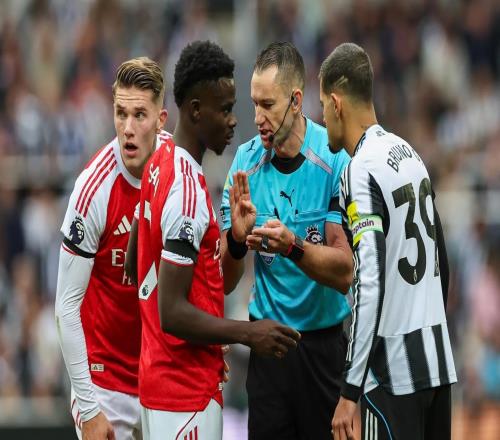 英超联赛第6轮,阿森纳2-1战胜纽卡斯尔的比赛是由贾里德-吉列执法的,他在比赛中先判给阿森纳一粒点球,在观看VAR后又取消判罚。他向萨卡解释这一判罚时,由于麦克风出问题,他说的话