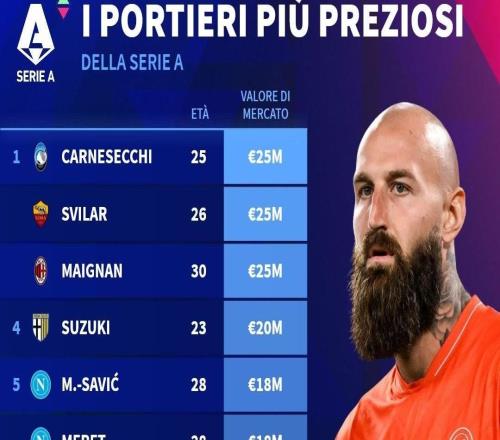 北京时间10月9日,在更新了意甲球员的身价之后,德转还列出了此次更新后意甲身价排名前10的门将,亚特兰大的卡尔内塞基、罗马的斯维拉尔以及AC米兰的迈尼昂同以2500万欧元并列第