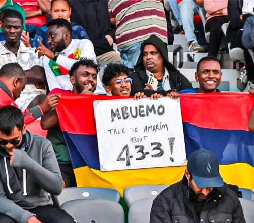 非洲球迷在看台打标语:姆伯莫,跟阿莫林聊聊433吧